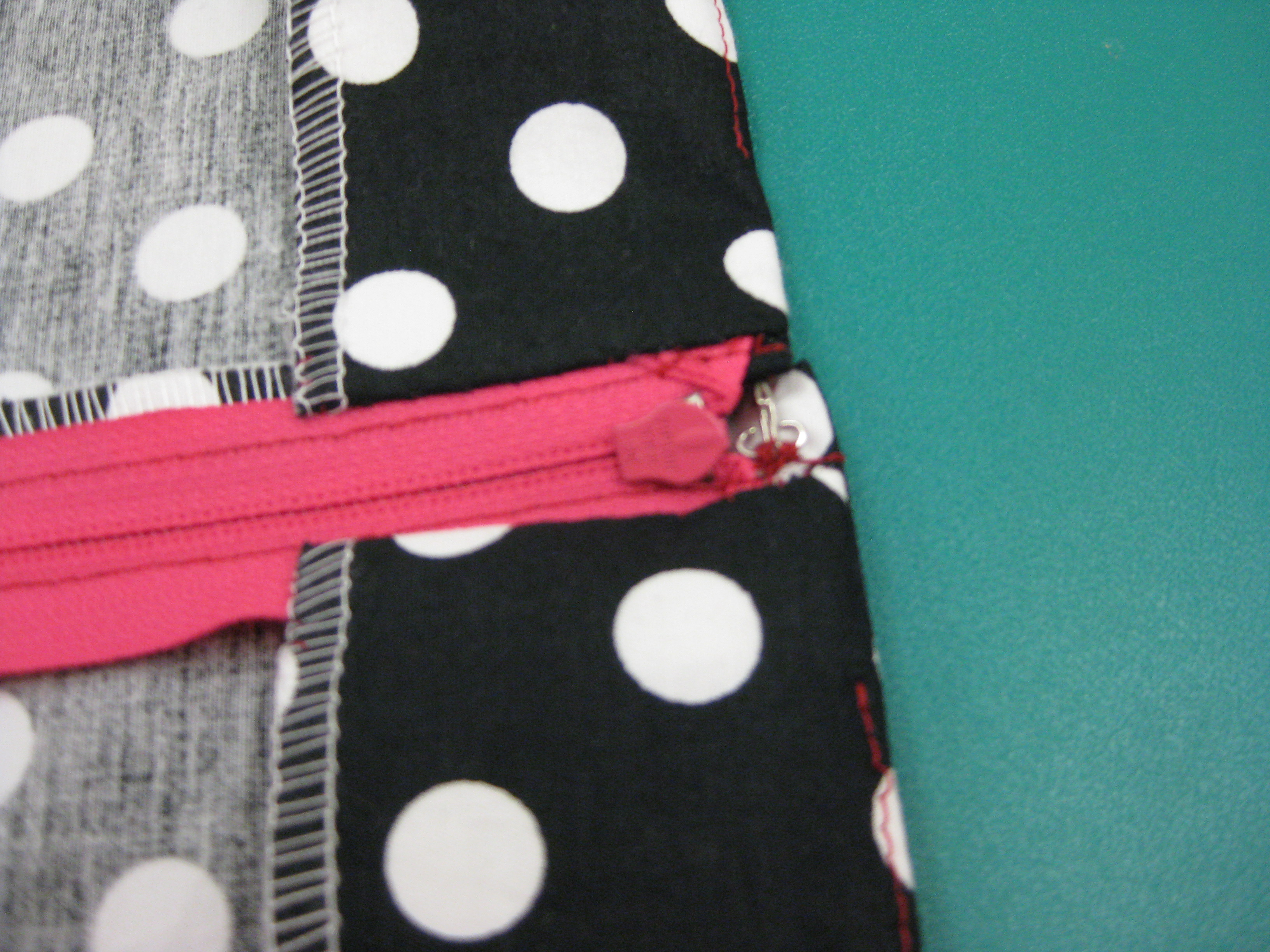 Red mark indicates the bottom of zipper stitching. Grey mark indicates start of stitching to close remaining seam.