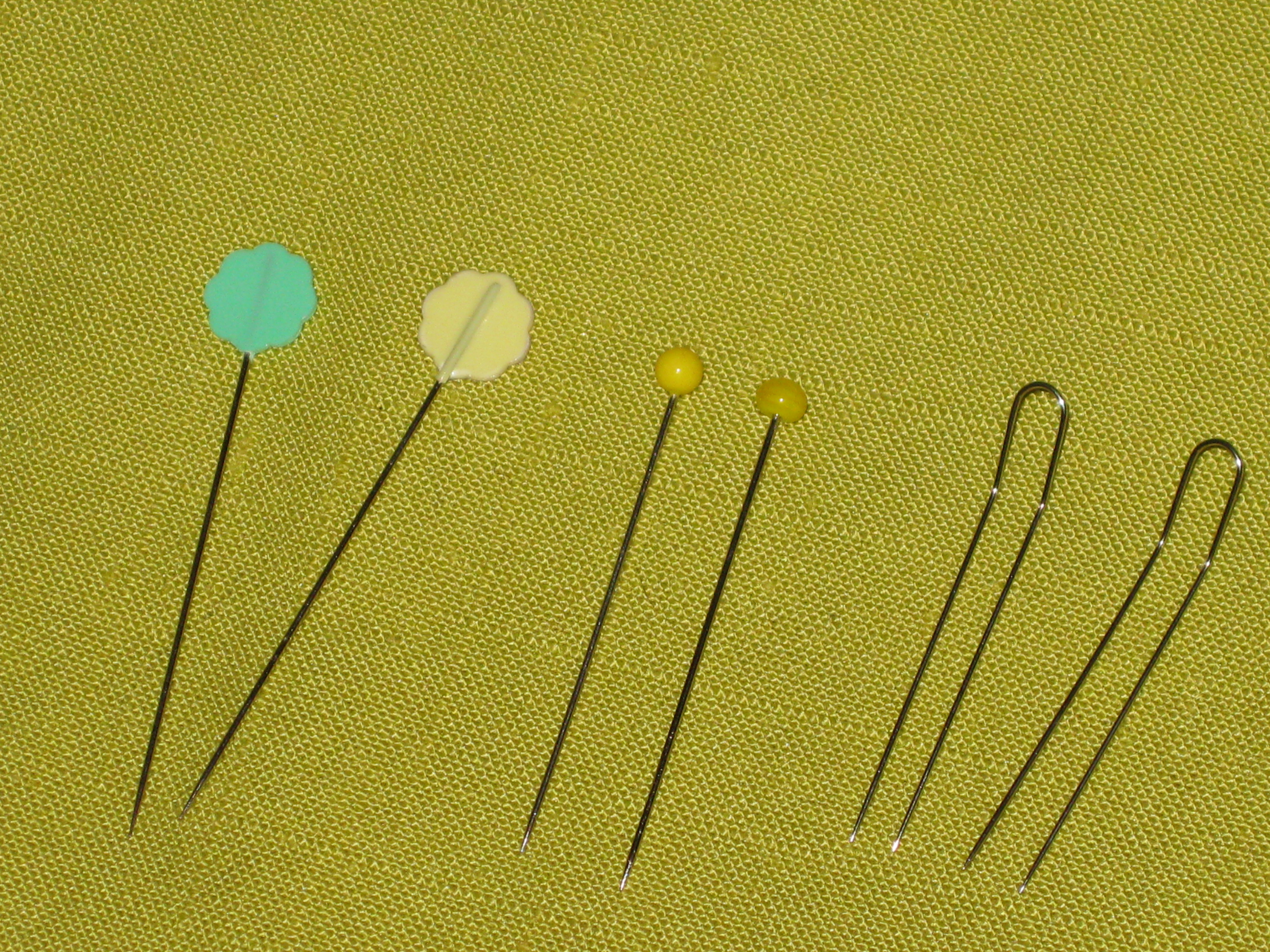 If using fine silk, I prefer to use silk pins. Flower (or novelty) head pins are very fine but they are also quite long and care is needed where they are used as it is very easy to catch the fabric with them. They bend very easily so they are not suitable for use in the fitting process.