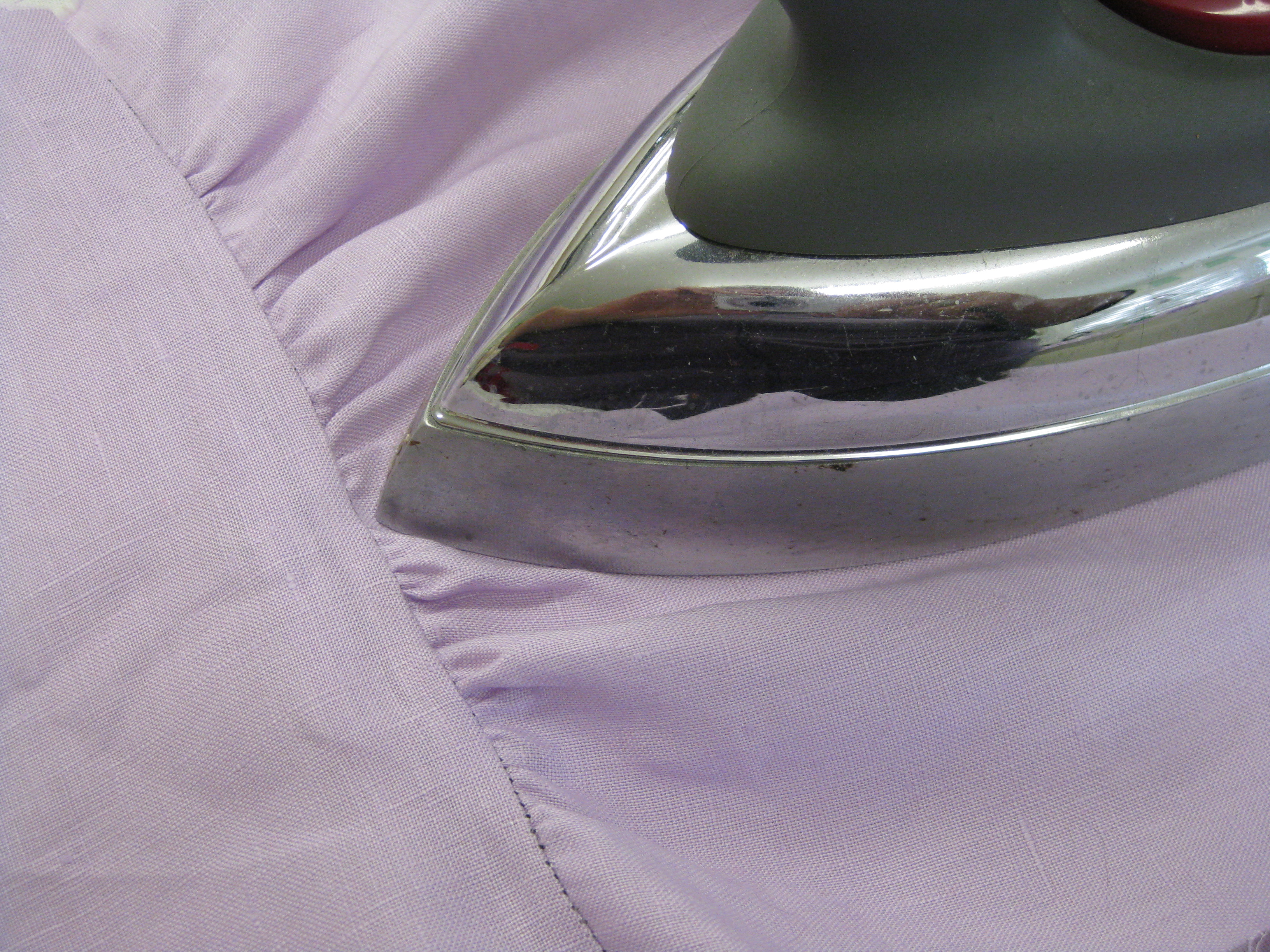 Once your gathered section has been applied to the rest of the garment, use the tip of the iron to press at right angles to the seam. Applying a gentle pull to the fabric will help to position the gathers with the iron.