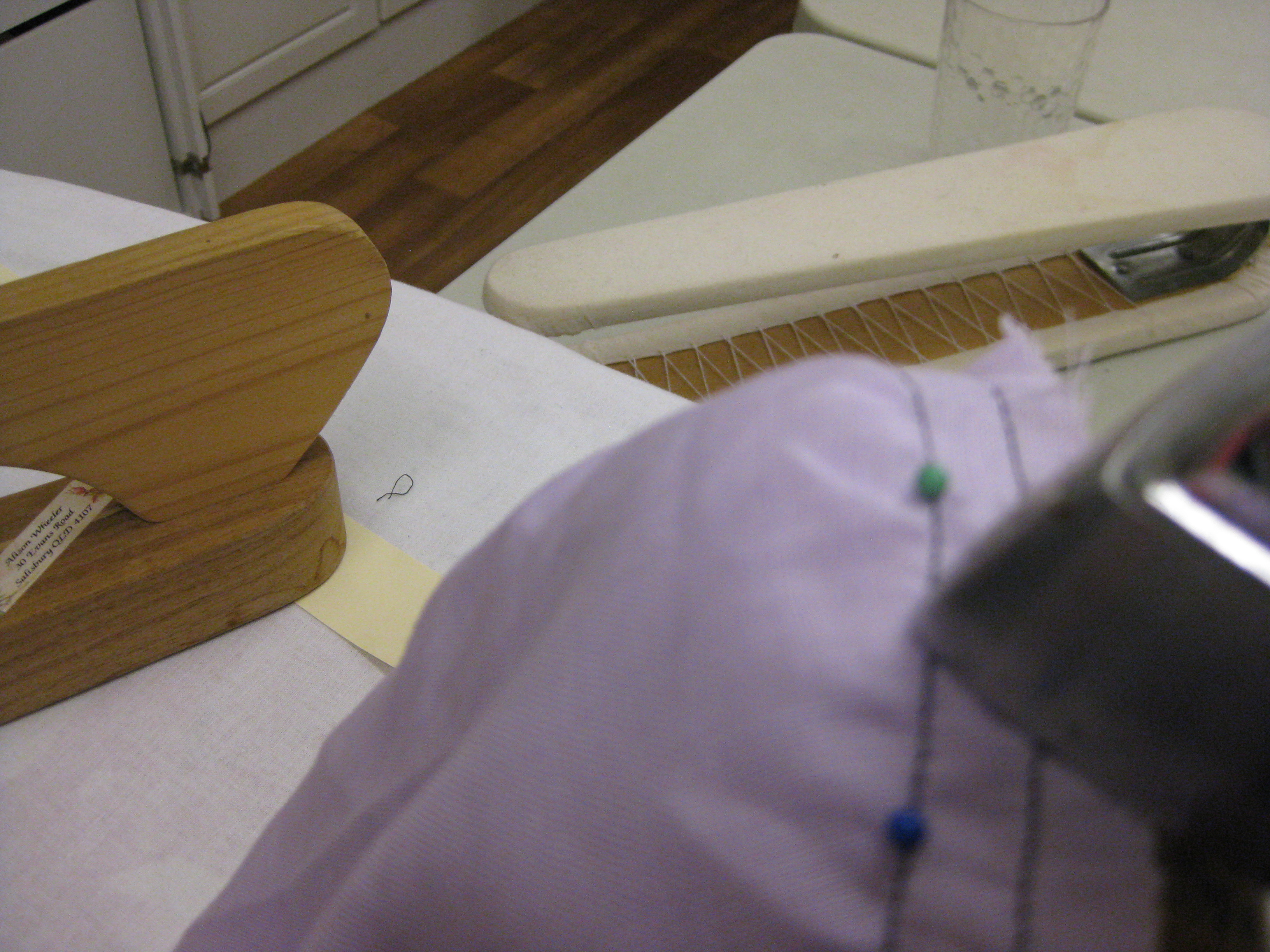 Once a set in sleeve has been eased, place the sleeve cap over a tailor’s ham and pin it in place along the seam line. Without touching the fabric, steam the sleeve cap. Press the seam allowance gently with your fingers to smooth it and allow it to dry completely before setting the sleeve into the armhole of the garment. This method results in a pucker free installation of the sleeve.