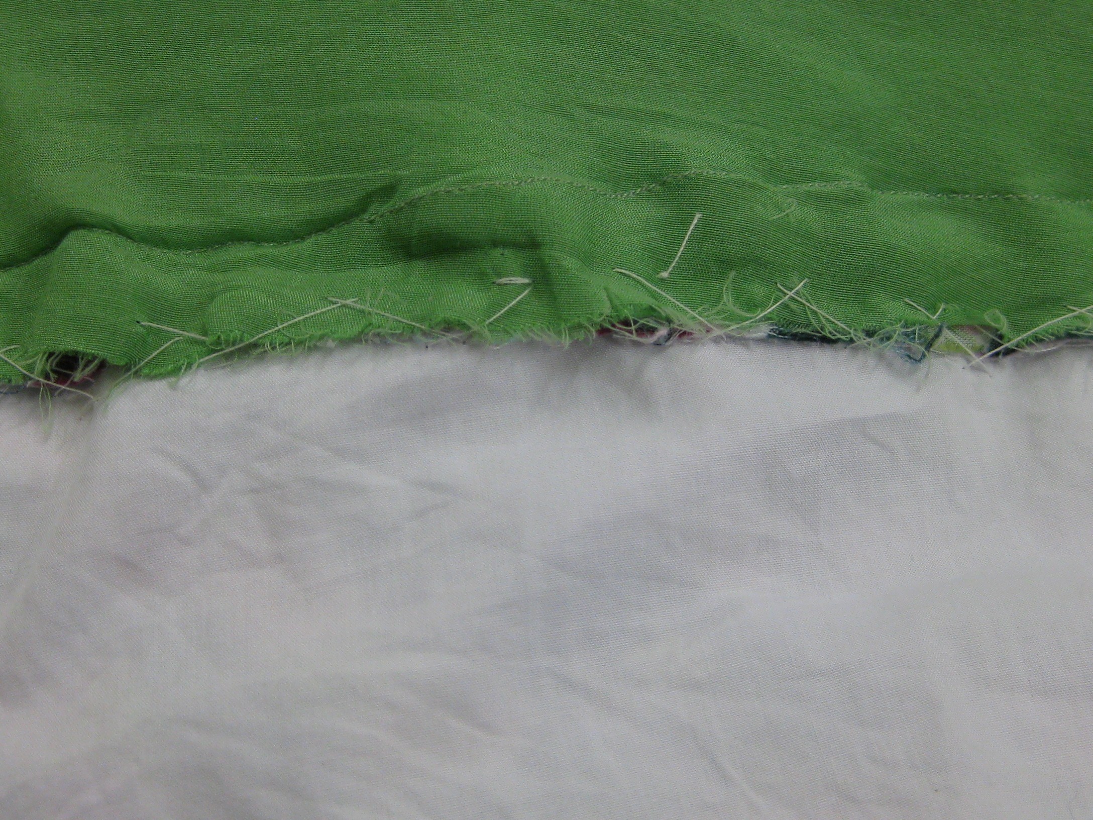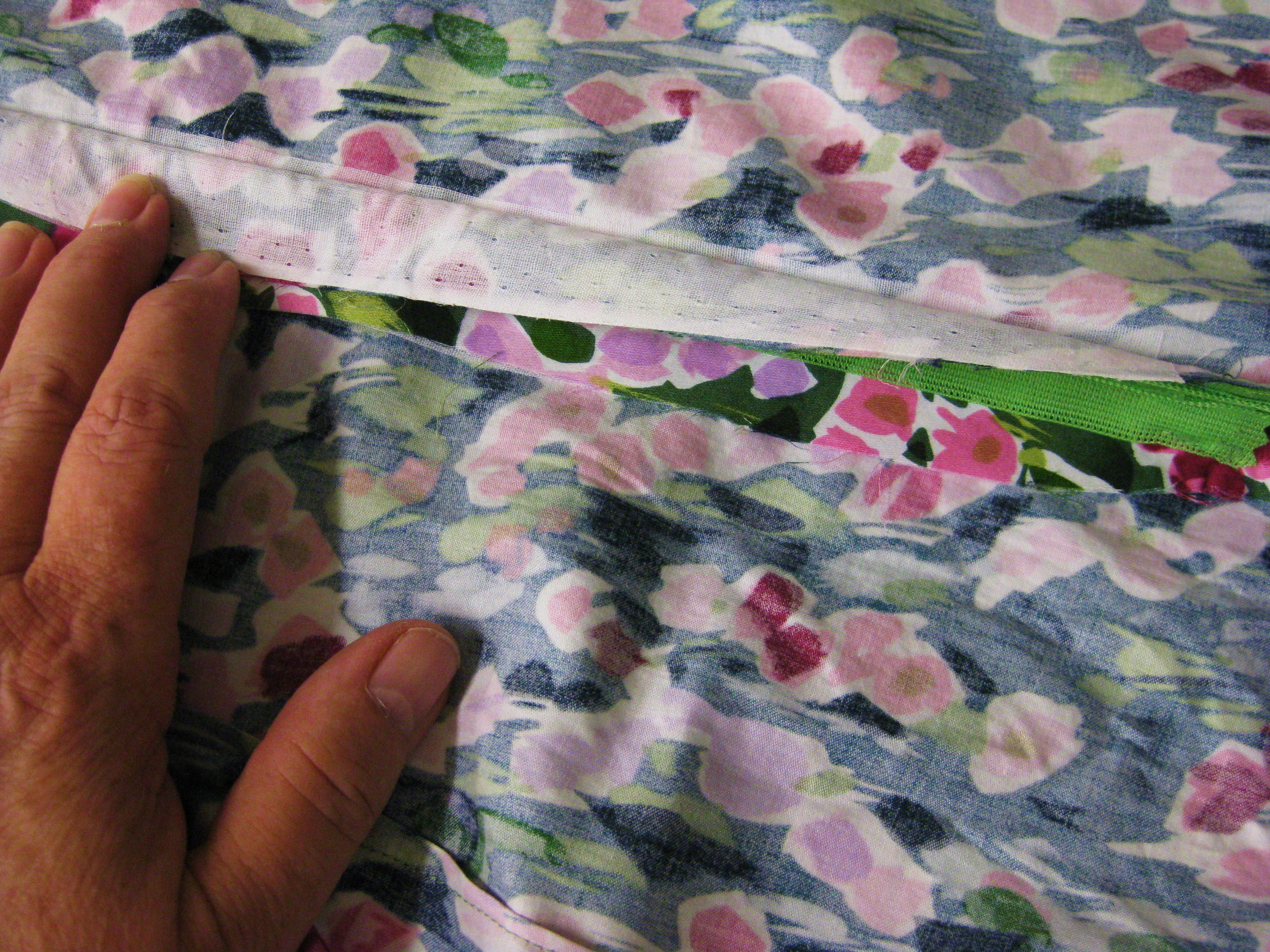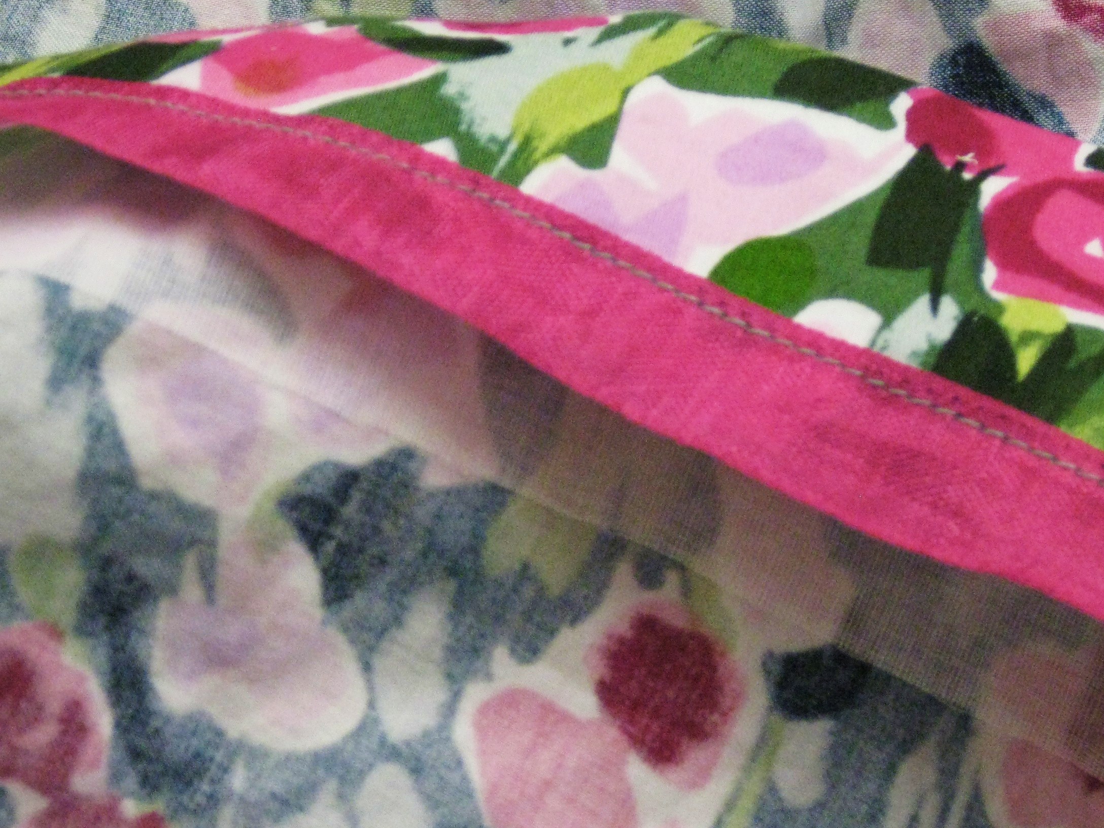 Lightweight fusible interfacing has been applied in the hem allowance before the edge was finished with rayon seam binding (Hug Snug) and stitched by hand.  This keeps the hemline in shape with this lightweight fabric.IMG_3006