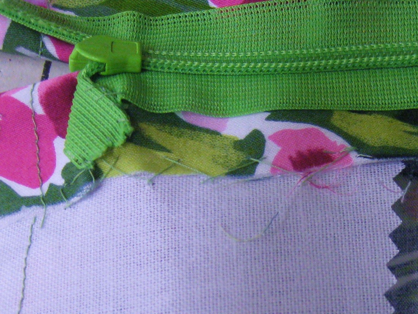 A strip of lightweight fusible interfacing was applied to the centre back seam to support the weight of the invisible zipper.  IMG_2951Once the zipper was installed, the tapes were attached to the interfacing at the top of the zipper – the stitch used is a catch stitch.