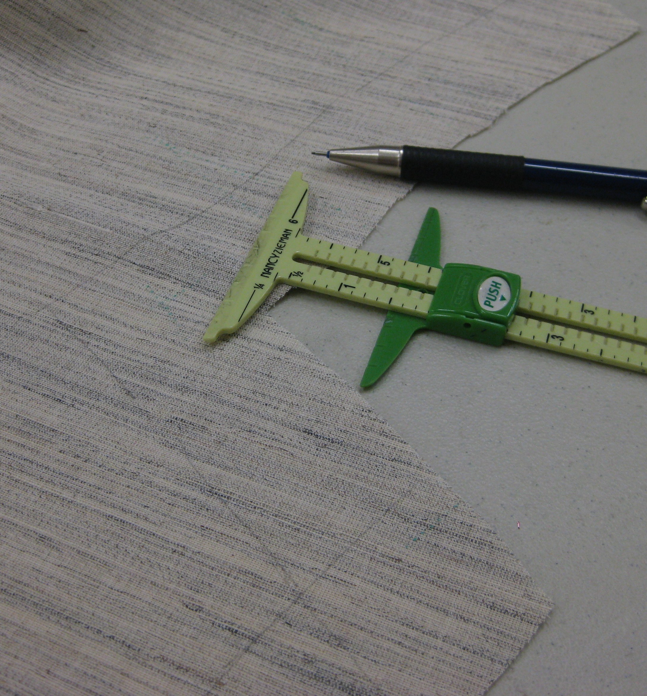 I have pencil marked a line at 1 ½” /3cm inside all cut edges that will be sewn into seams. The dart fabric has been removed in preparation for attaching the hair canvas to the mounting cloth..