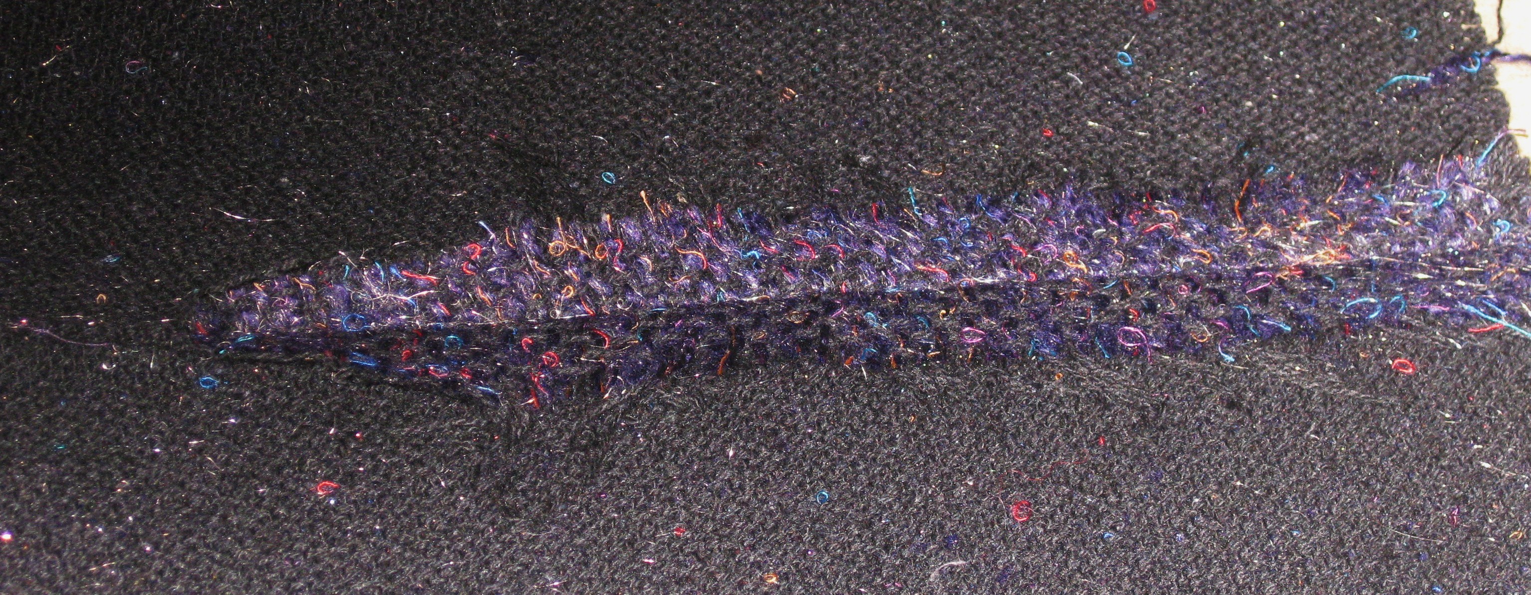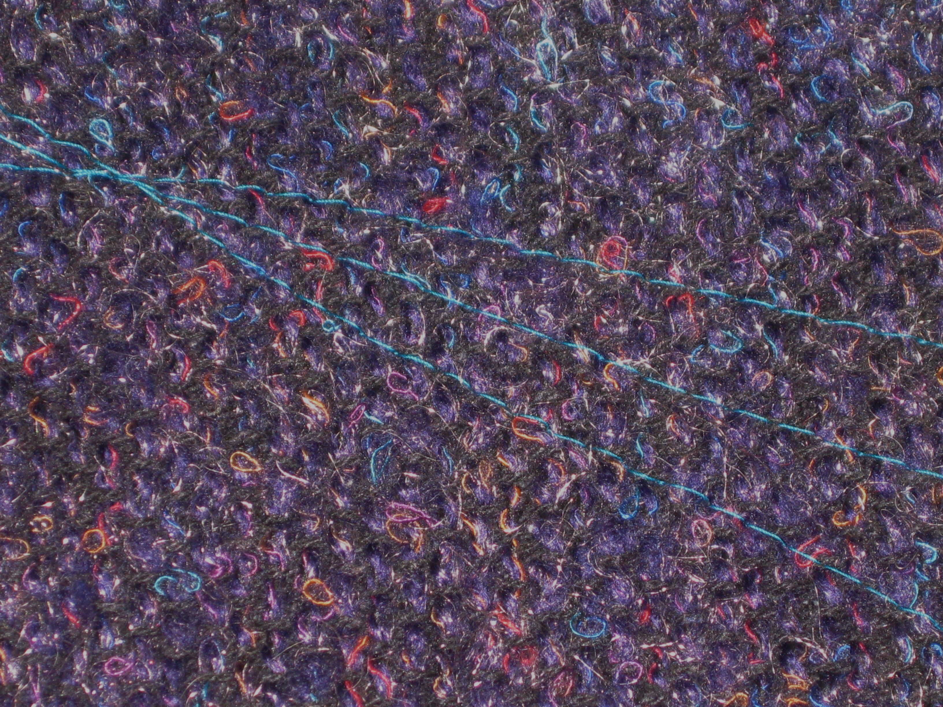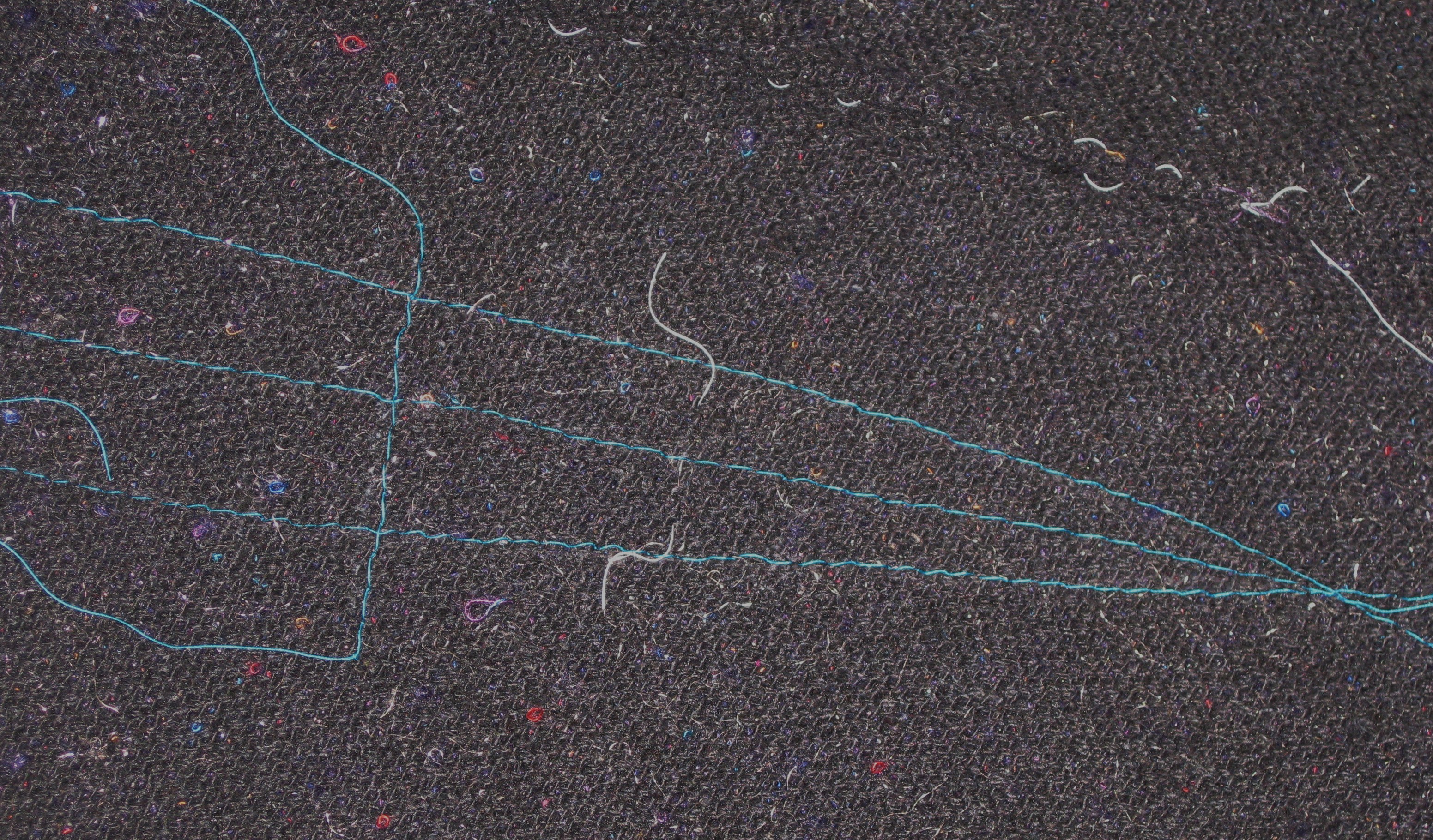 The markings for the pouch pocket were traced on to the wrong side using dressmaker’s carbon. They were then thread traced by hand. Because of the textured surface and the need accurate and clear markings, I decided to machine baste the markings as well (used a stitch length of 6.0 which was easy to remove).