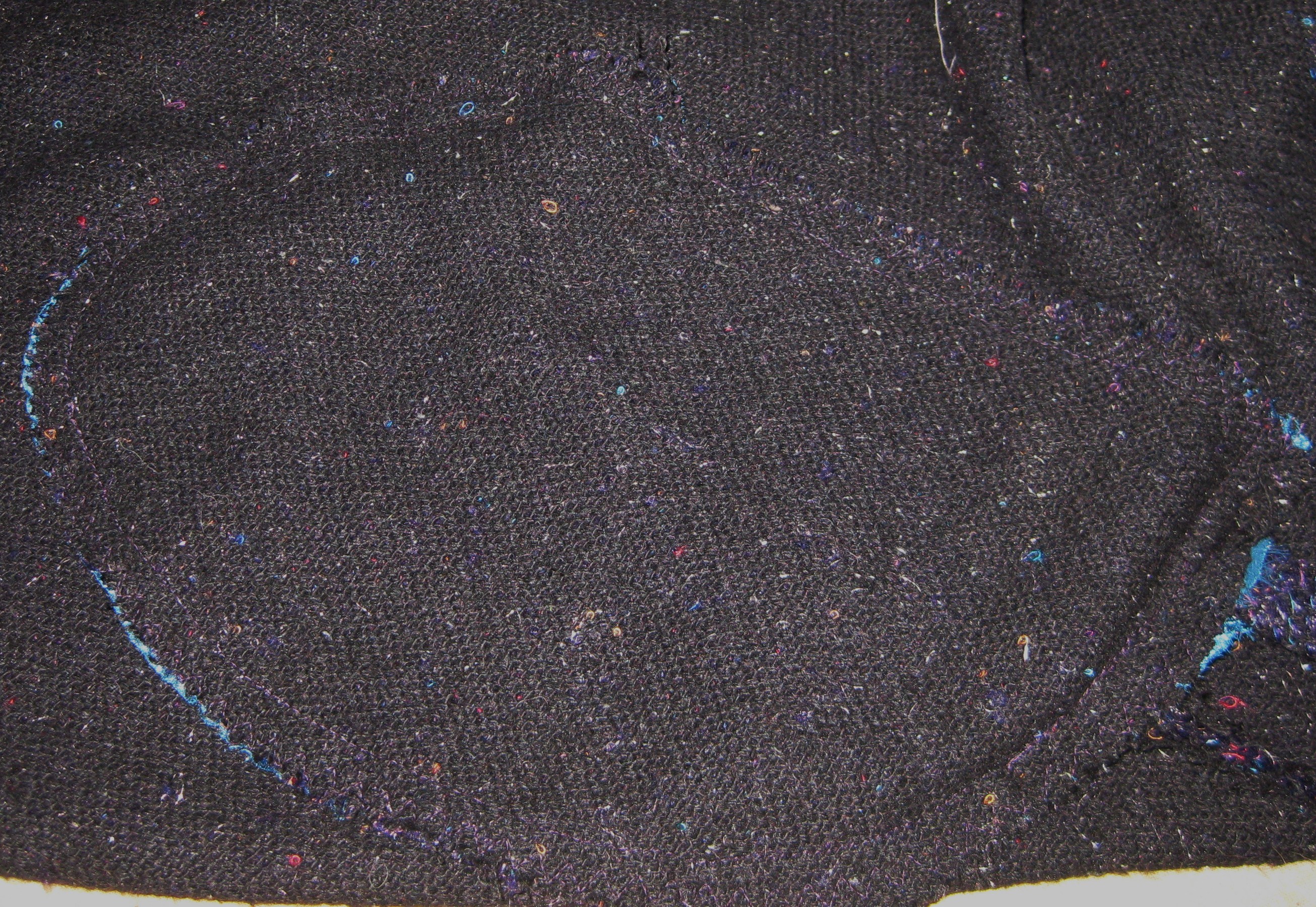 Details on this large piece include six hemline darts, two double ended “waist” darts and an interesting pouch pocket.