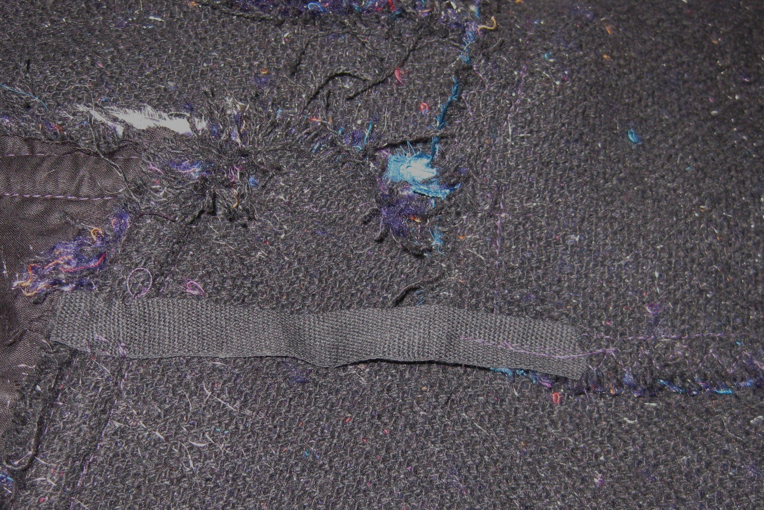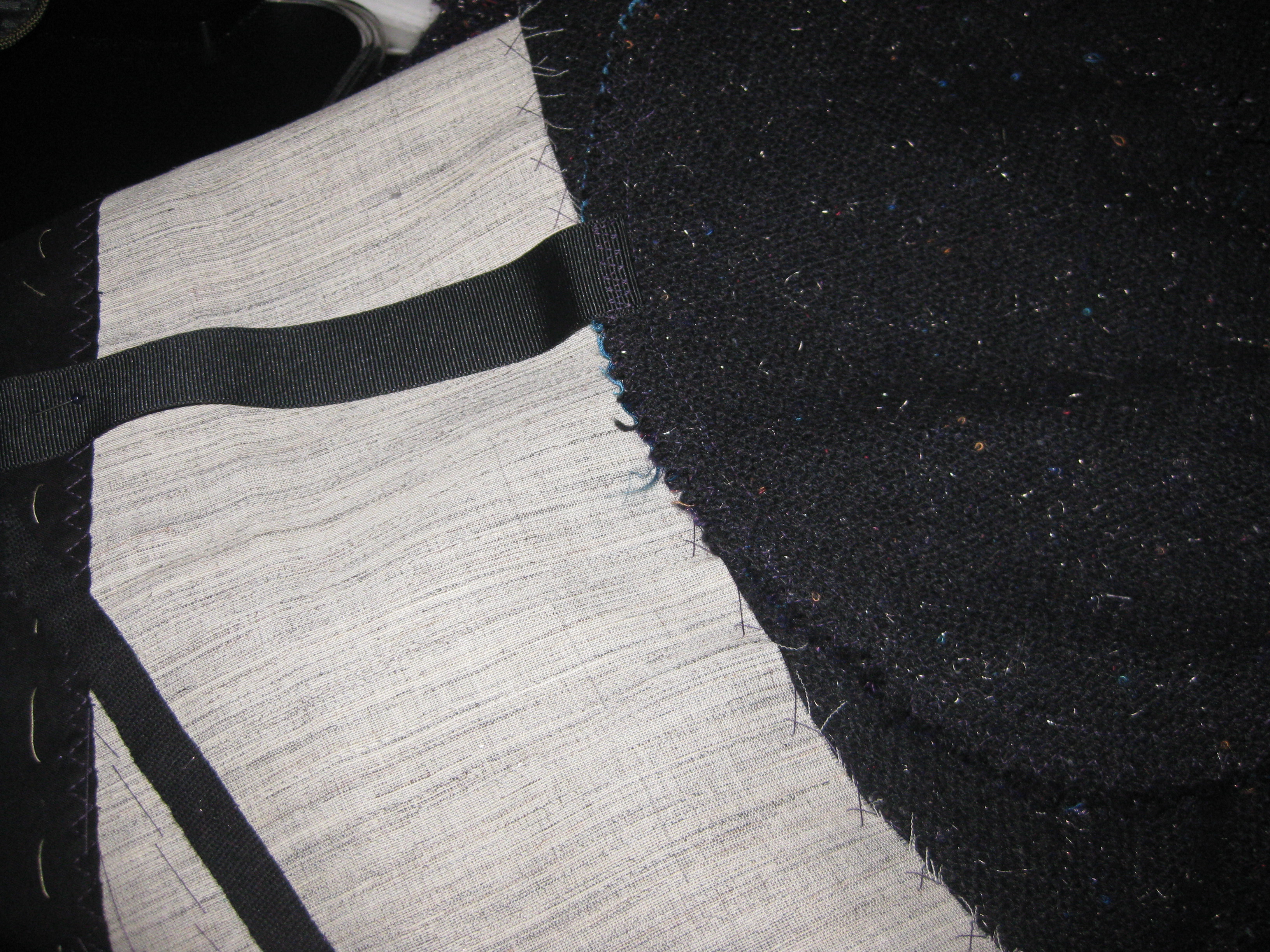 The pouch pocket is quite unstructured and rather floppy so, to keep it in place, I have added pocket stays to the waist seam line and front edges of the jacket. Cotton tape and grosgrain ribbon were used for these stays.