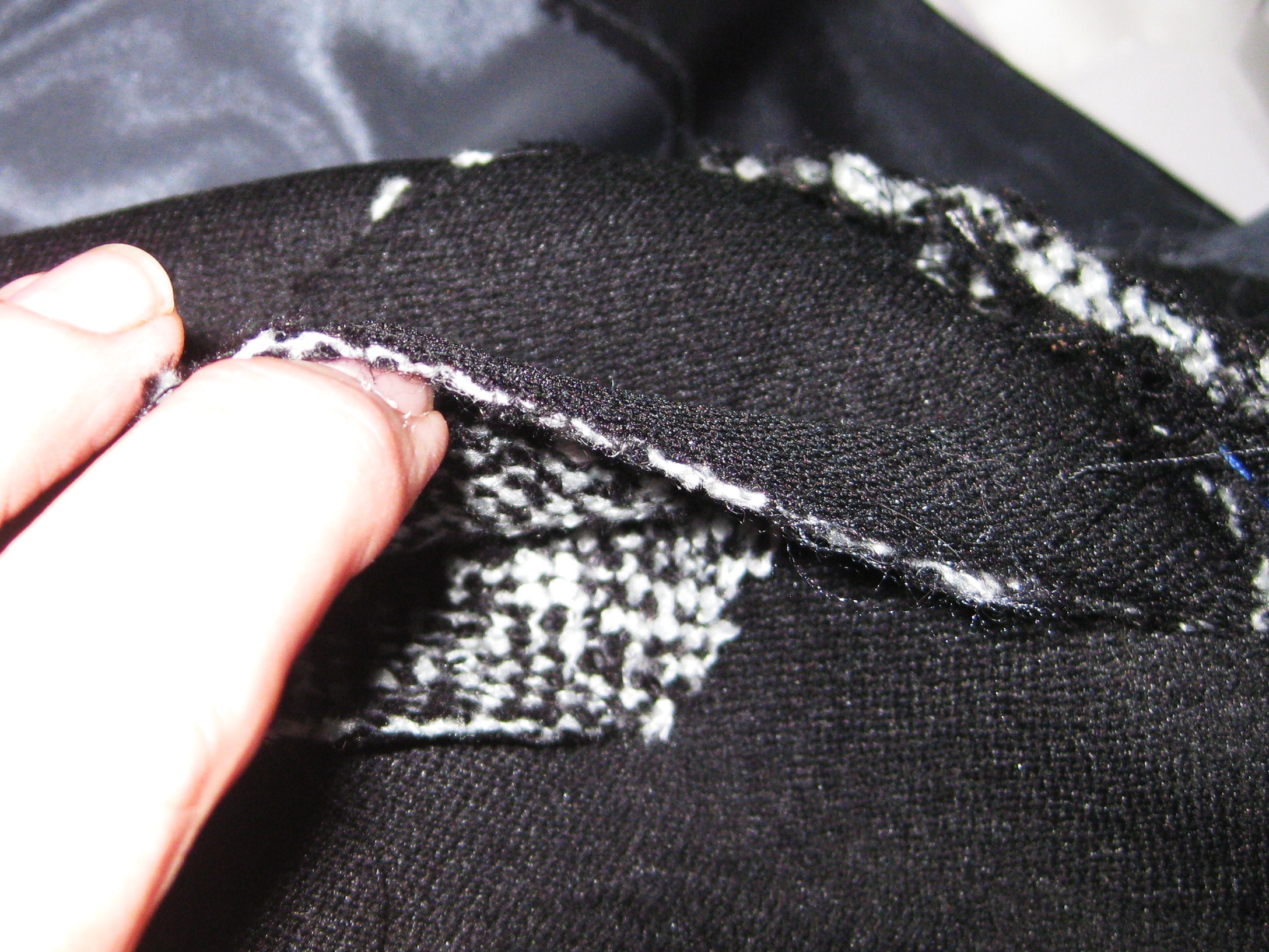 Because of the swing back, the jacket lining has been hemmed and left hanging separately.  Hong Kong finish has been applied to the jacket hem which was then hand stitched in place.