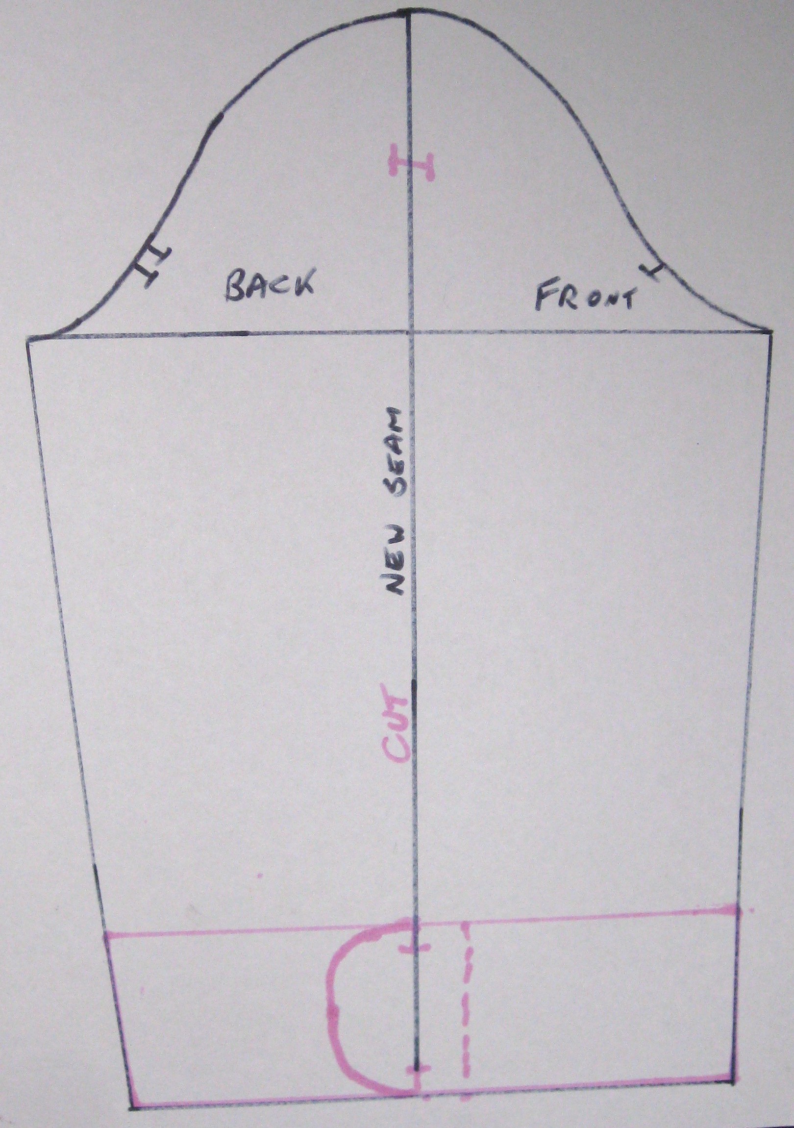 Again using the KwikSew pattern which has a one piece sleeve, I drew a seam line down the centre of the sleeve and drew in the sleeve flap which lies towards the back section.