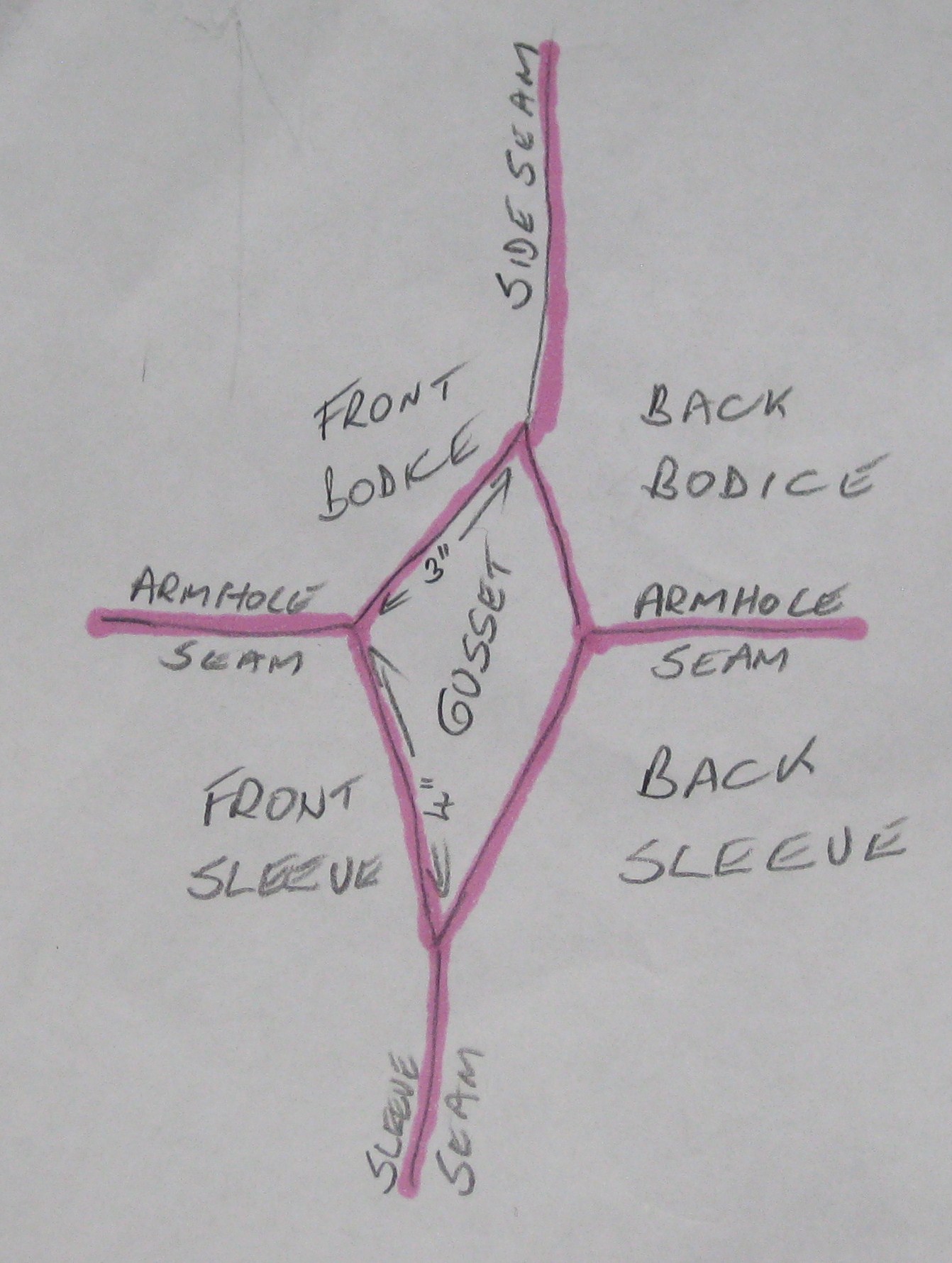 To fix the problem, I have inserted an underarm gusset.  This is a good solution for any sleeve that binds a little around the bicep area.