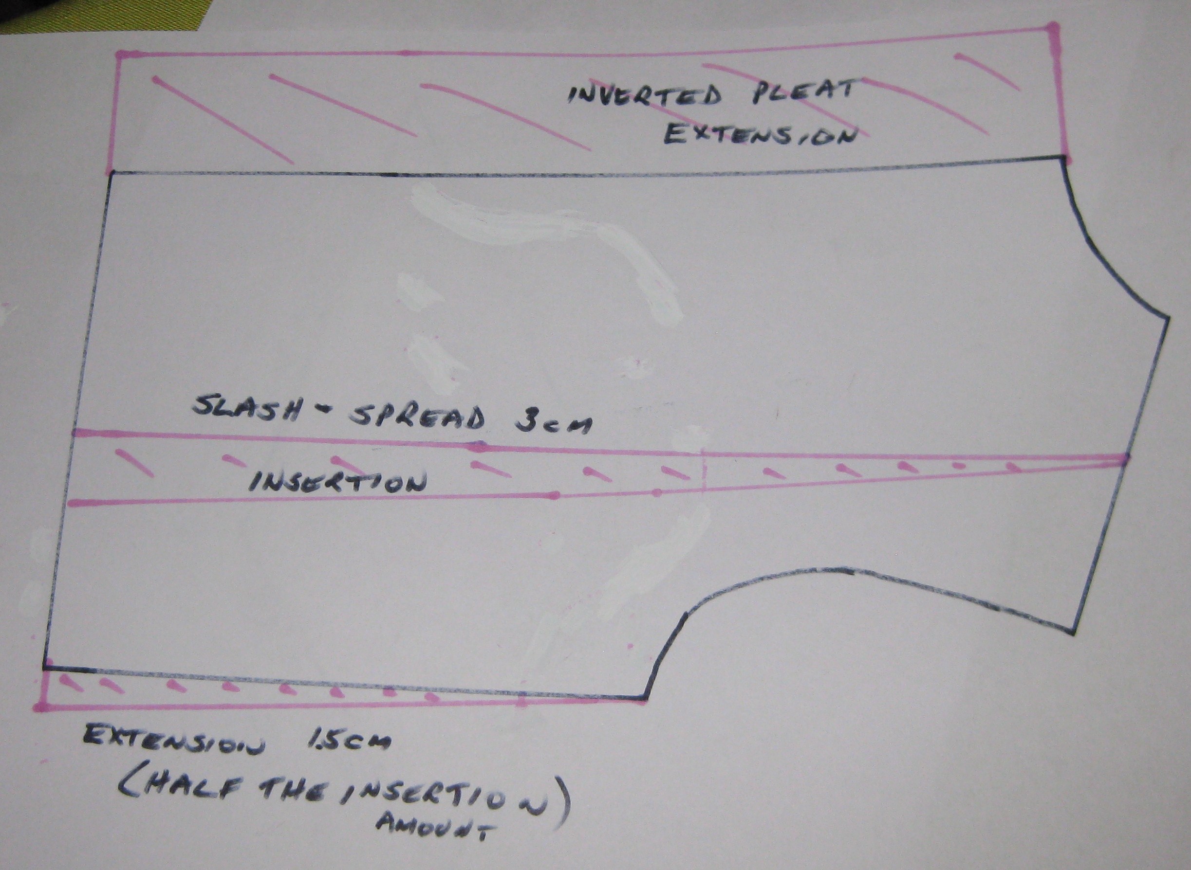 To achieve the swing back, I used the back pattern piece from the KwikSew pattern which was to be cut with centre back on the fold and positioned  the centre back 3 inches /7.5 cm from the fold which resulted in an inverted pleat.   A line was also drawn parallel to the grain line from the centre of the shoulder to the hem.  This insertion was cut and spread by 1 ½” / 3cm at the hem and an extension added to the back side seam ( ¾” / 1.5cm which is half the insertion measurement).  Using this ratio, more could certainly be added to achieve a fuller swing.