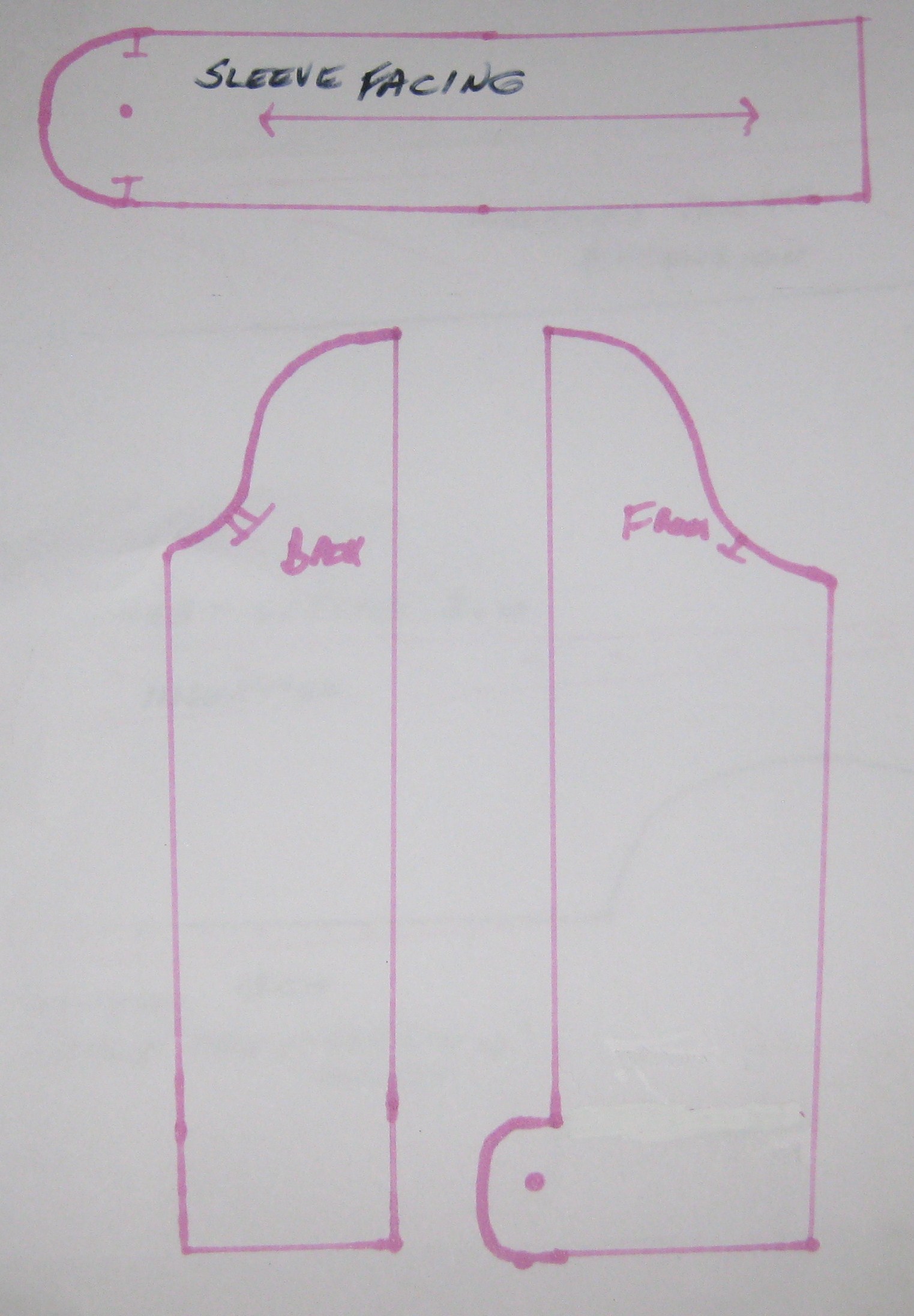Centre seam line added to sleeve; width of facing and sleeve hem detail drawn on to KwikSew sleeve