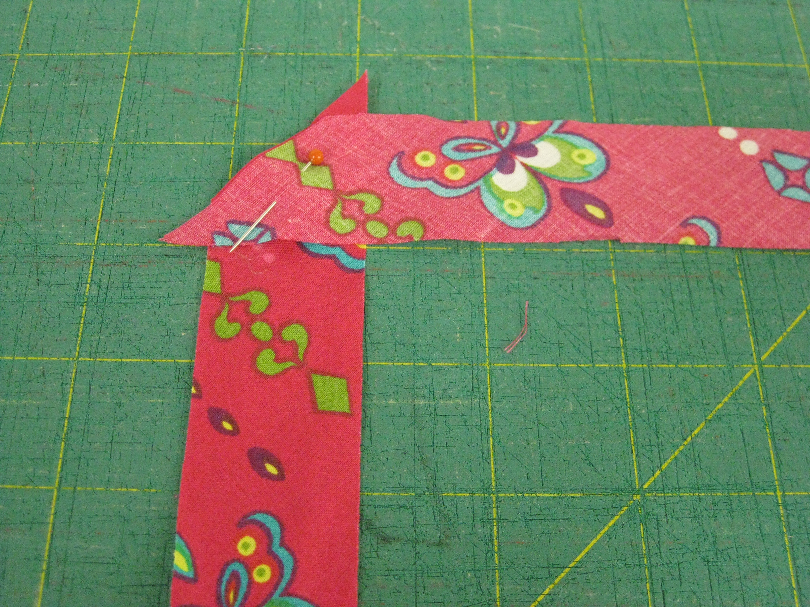 If you do not have enough length in one strip, it is quite easy to join strips.  Simply cut several strips in the same width.  Place one strip right side up vertically on a grid; take another piece and place it with right sides together at right angles and to the right of the first piece.  Pieces are then stitched across the diagonal –hold threads to start stitching; use small stitches and do not back stitch.  Seams are trimmed to 6mm and pressed flat and then open.