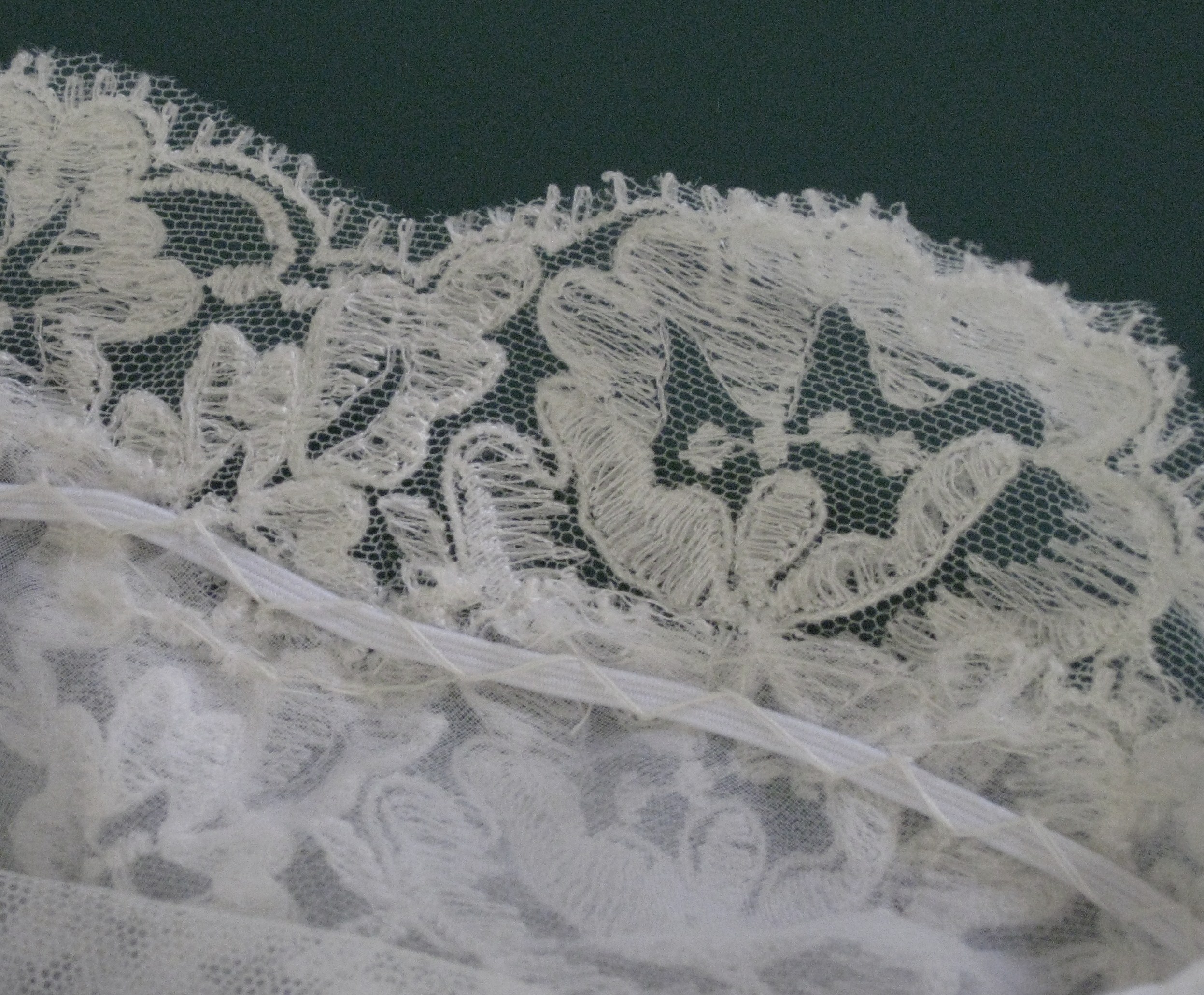 Neckline/shoulder stays hold the shoulder and sleeves in place with a wide deep neckline in the front and back. They are made from narrow braided elastic couched in place with catch stitch and fastened at each end.