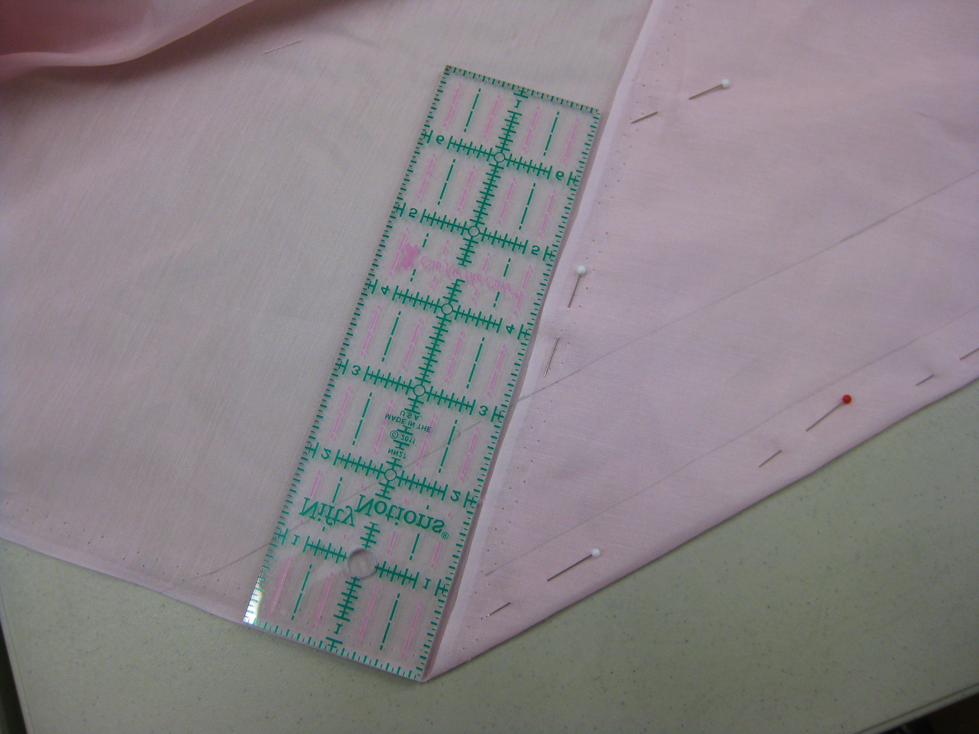 photo-8a-marking-bias-strips-fold-fabric-edge-at-90-degrees-to-selvage-draw-lines-parallel-to-folded-edge-cut-strips-carefully-with-long-blade-scissors Published December 13, 2016 at 3264 × 2448 in Elegant in Pink – Vogue 9148 ← Previous Next → Ruler used to cut true bias before using scissors to carefully cut bias strips