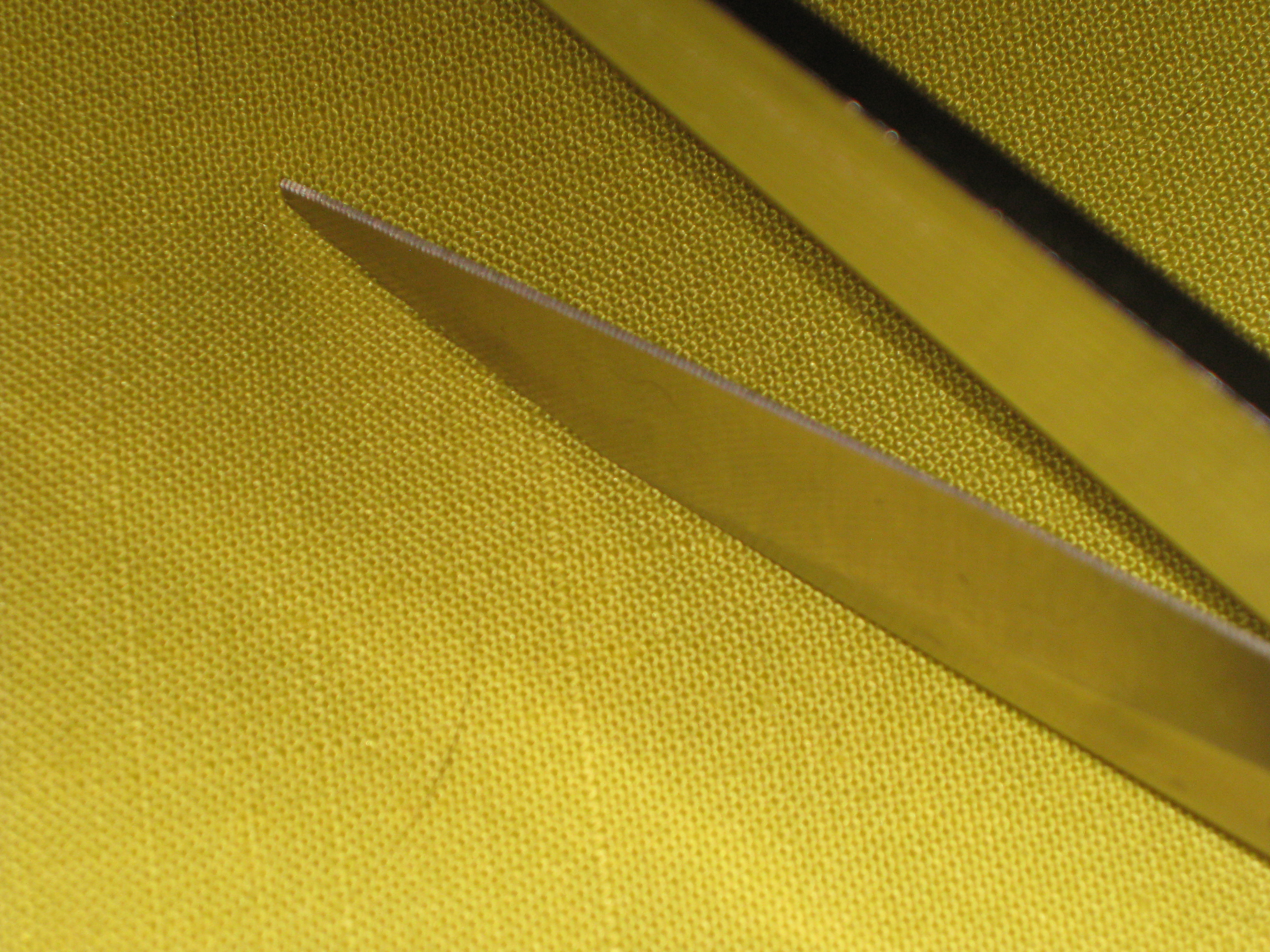 Using shears with one serrated blade is a great help as the serration stops the fabric moving and sliding as it does across the smooth blade when the shears are closed.