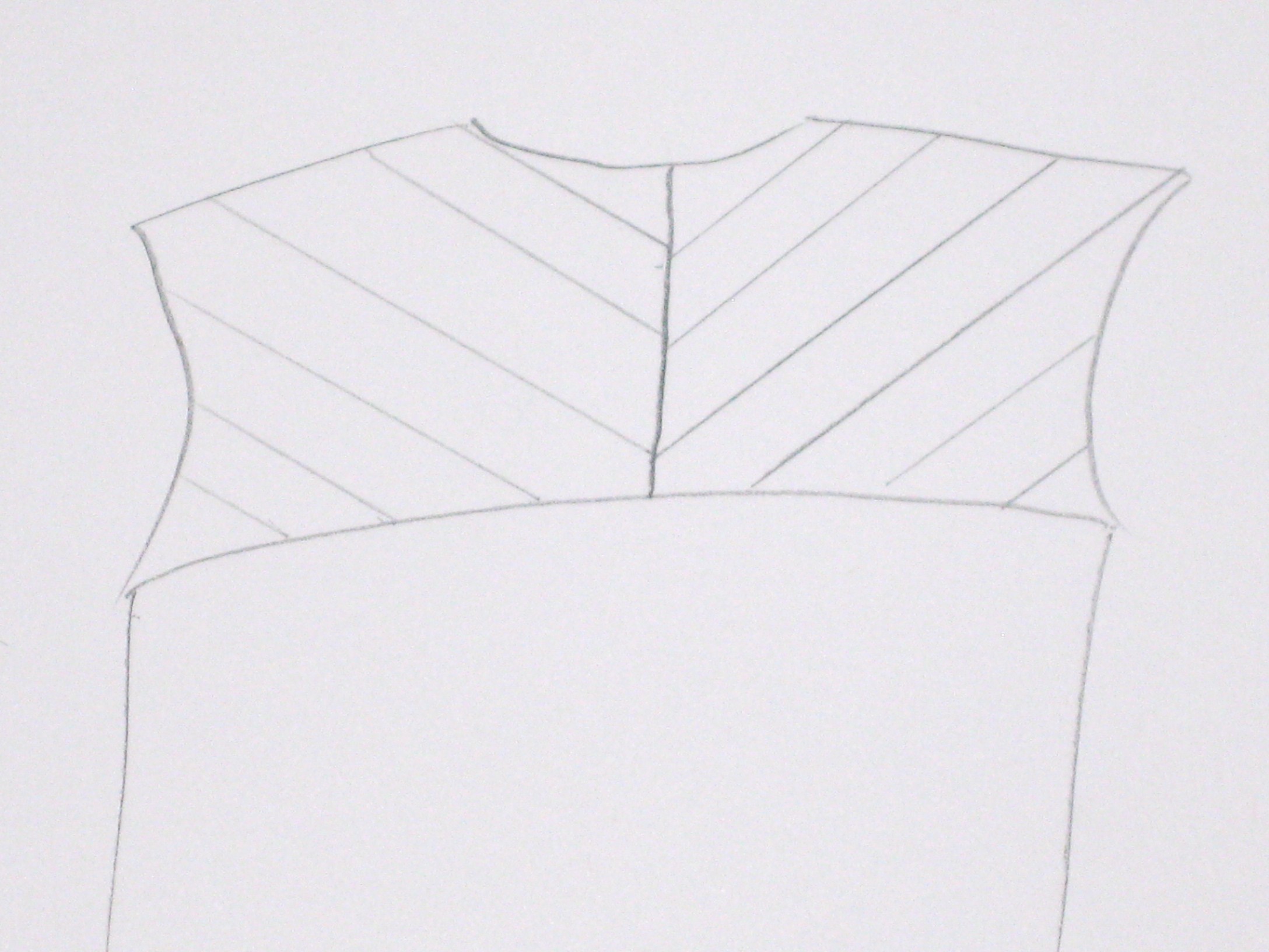 Mark centre of yoke. Cut apart and add seam allowance. Add bias grain line.