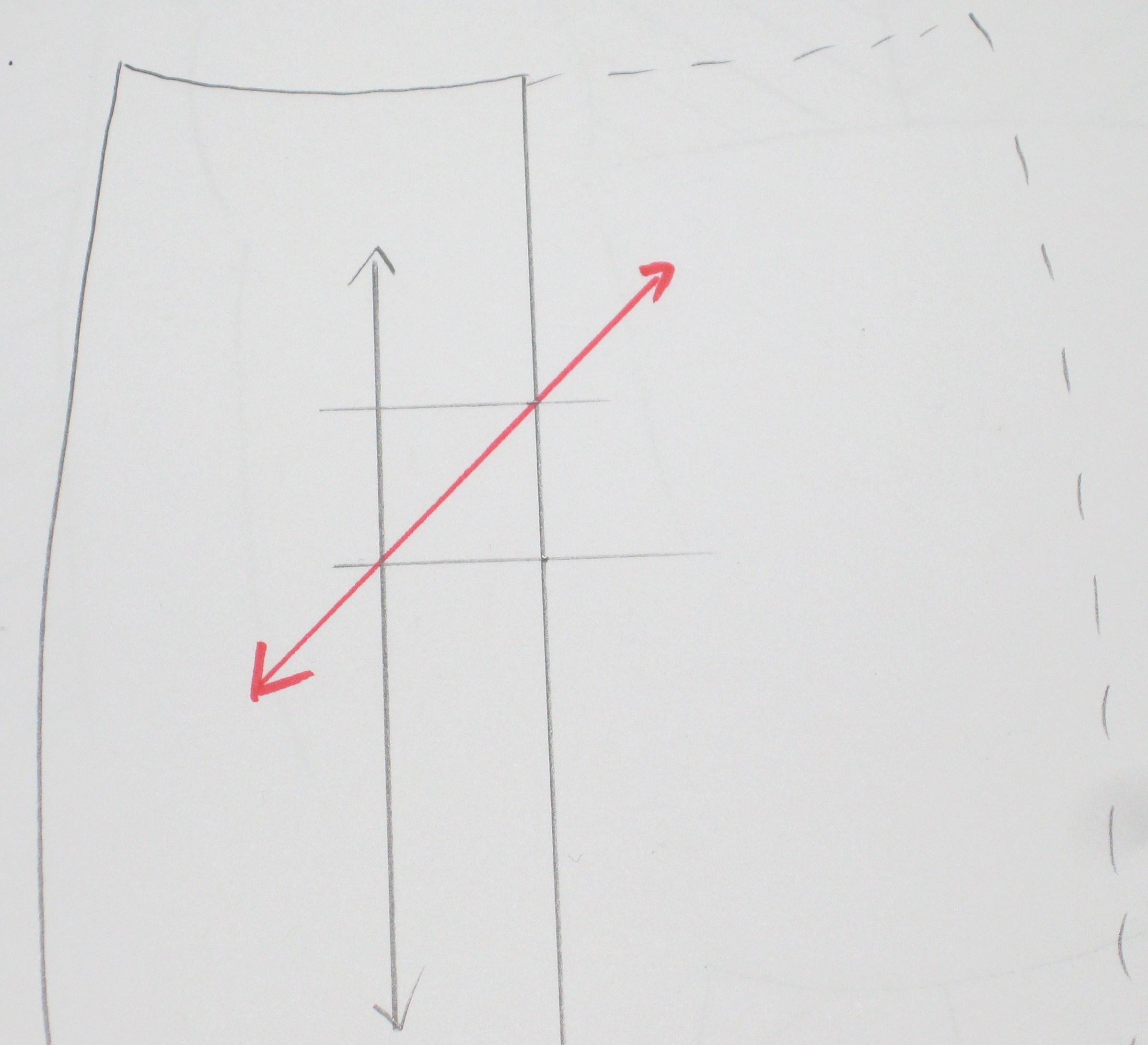 To draw a bias grain line, make a small 1″/2cm square box on the side of the existing grain line. Place ruler on opposite diagonal corners and draw a bias grain line.